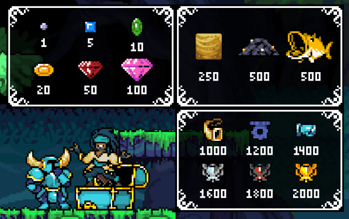 Since this currency system is such an important part of Shovel Knight’s playstyle, with the relics and armours greatly impacting how you will play each game, it’s important to understand the values of each gem and item. The below image shows the value of each gem and item, as well as the values for an Up Strong Rock, Down Special’s Treasure Pile, and the Golden Troupple Fish.